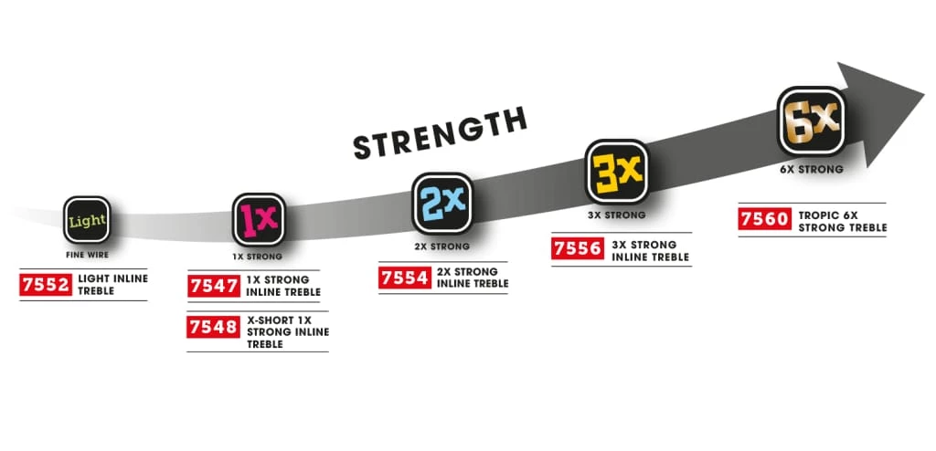 Barbed version of VMC – 7547B 1X Strong Inline Treble Hooks. Reinforced model with Needle Sharpโข point. Perfect for arming lures. Modern shape designed to increase catch rate.